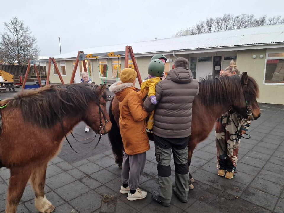 Krakkahestar komu í heimsókn í dag í boði foreldrafélagsins. Það var mikil gleði og ánægja með þessa ferfættu gesti okkar þá Ragga rúsínurass, Óvissu og Svan gamla.